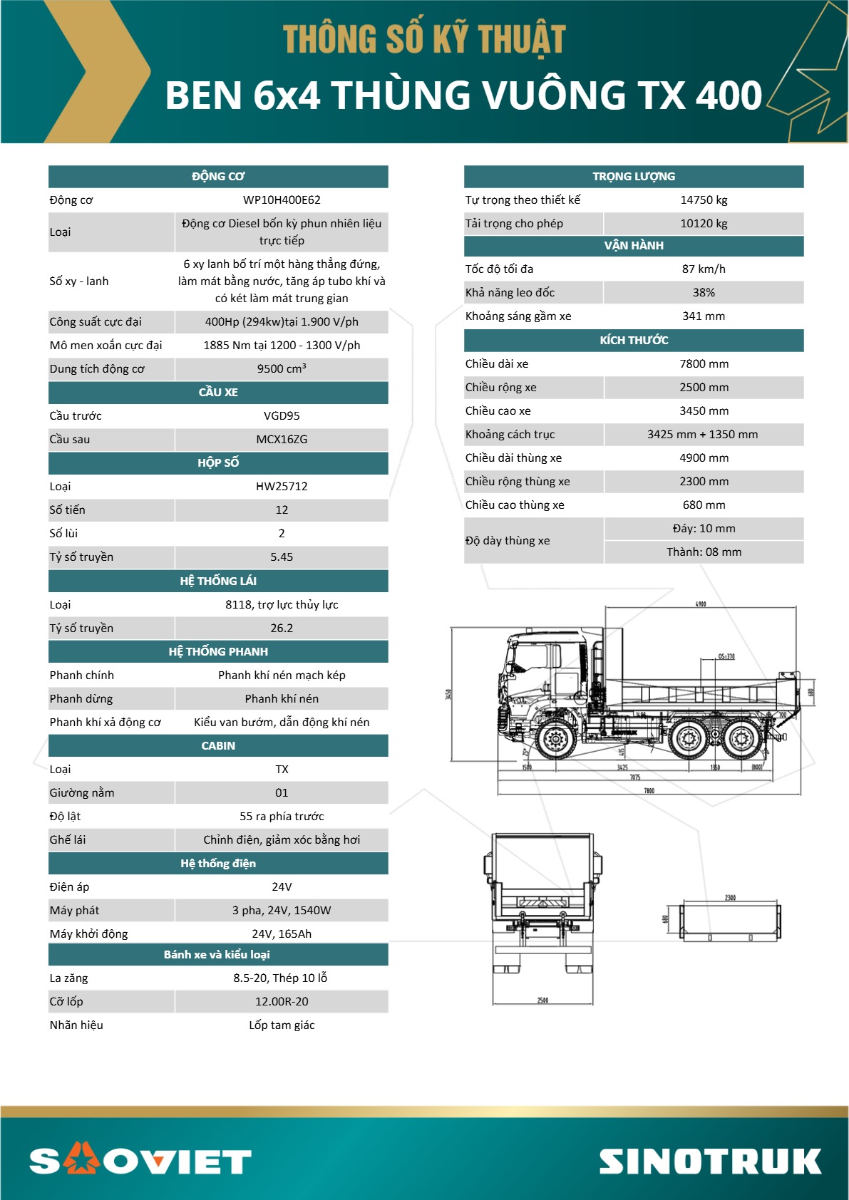 Chi tiết dòng xe Ben 6×4 thùng đúc TX 400 – Dòng xe đầu kéo đời hoàn toàn mới, được nhập khẩu và phân phối độc quyền bởi Sao Việt.