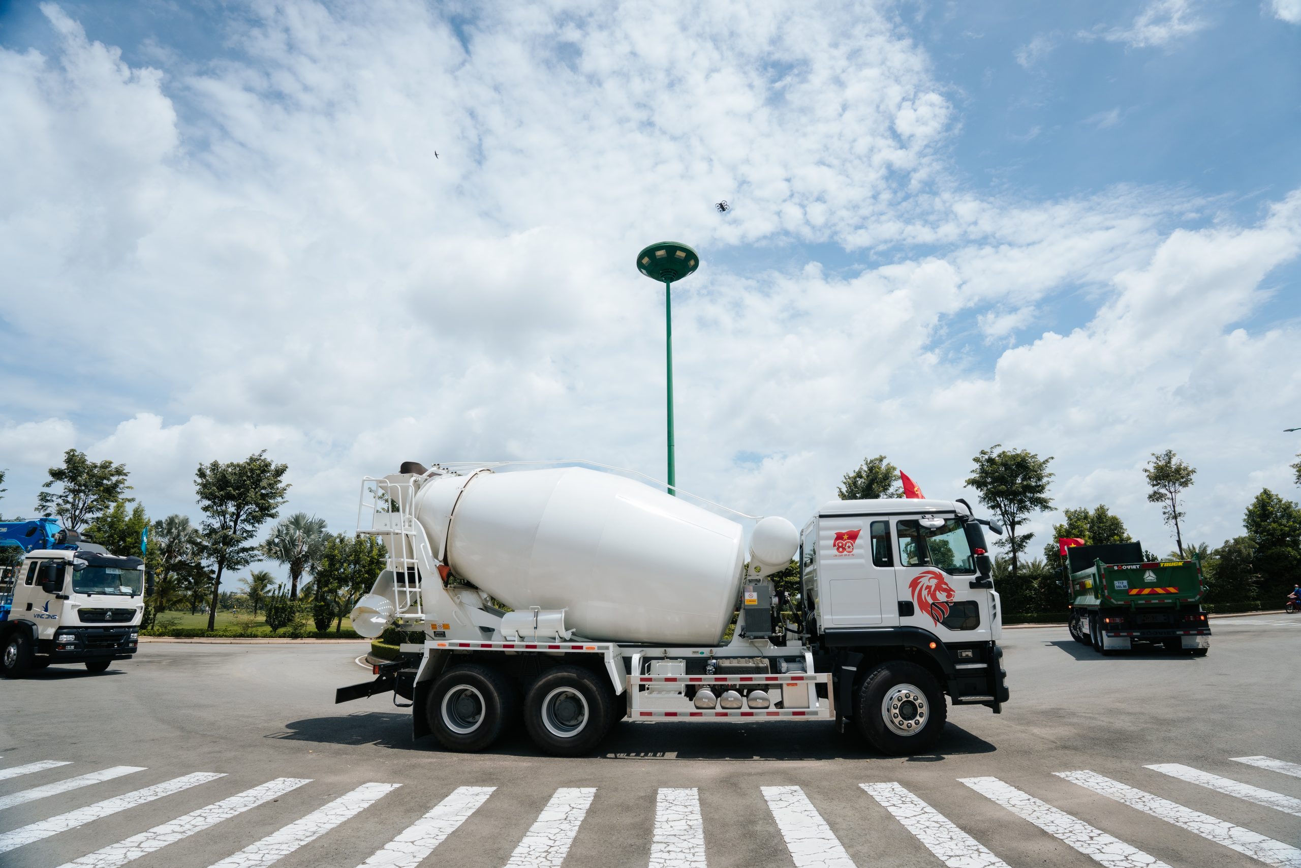 An toàn: Hệ thống phanh tang trống dẫn động khí nén 2 dòng, kết hợp phanh lốc kê tác dụng lên bánh sau, đảm bảo an toàn tuyệt đối khi dừng đỗ tại các điểm đổ bê tông có độ dốc.